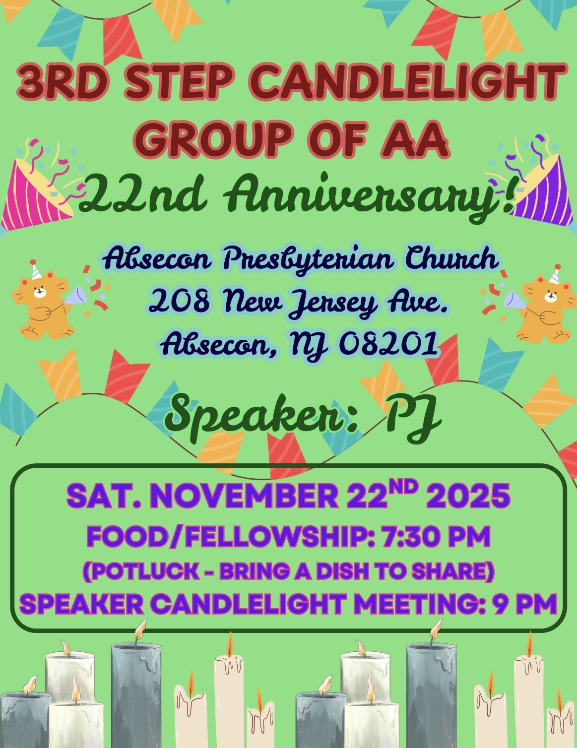 - South Shore Group Thursday night on 11/6/25 changes to 6:30pm