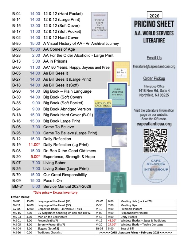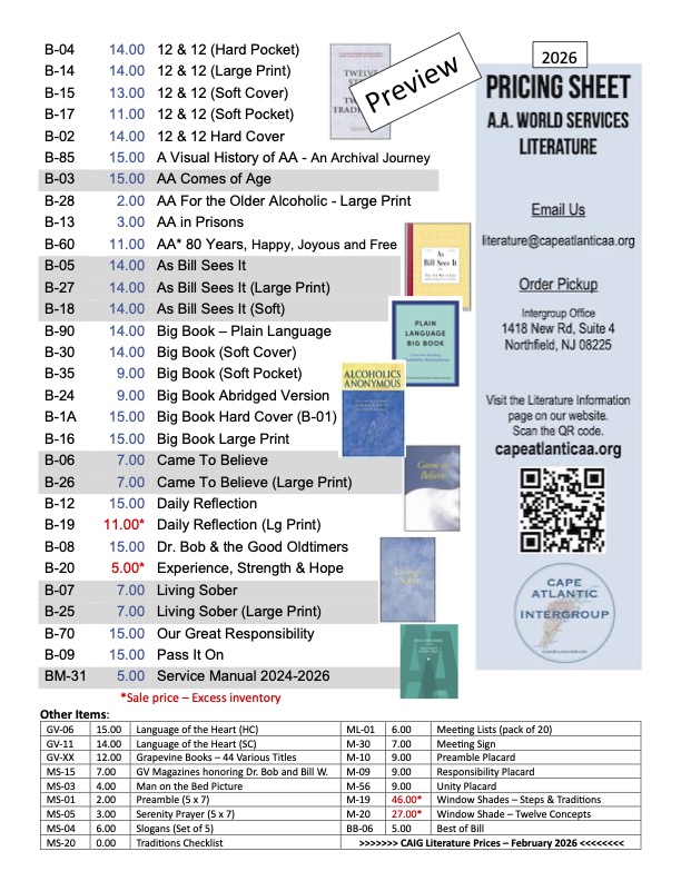 Cape Atlantic Intergroup can help with the purchase of A.A. approved literature, Grapevine books, as well as displays and signage materials for your meeting.