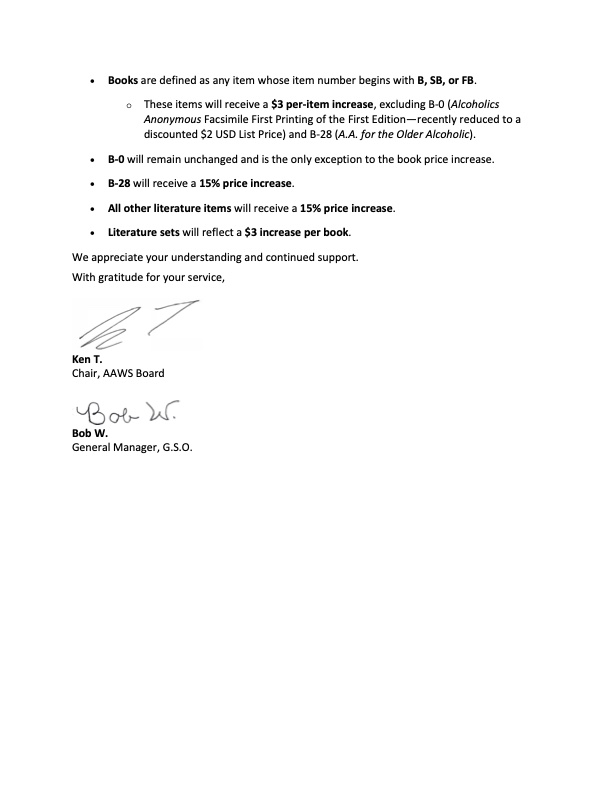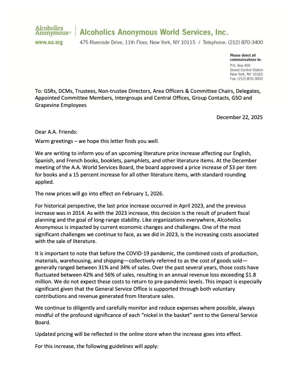 In order for our Intergroup to meet the goal of breaking even with our literature budget we must also raise our prices for AAWS books starting on February 1st.